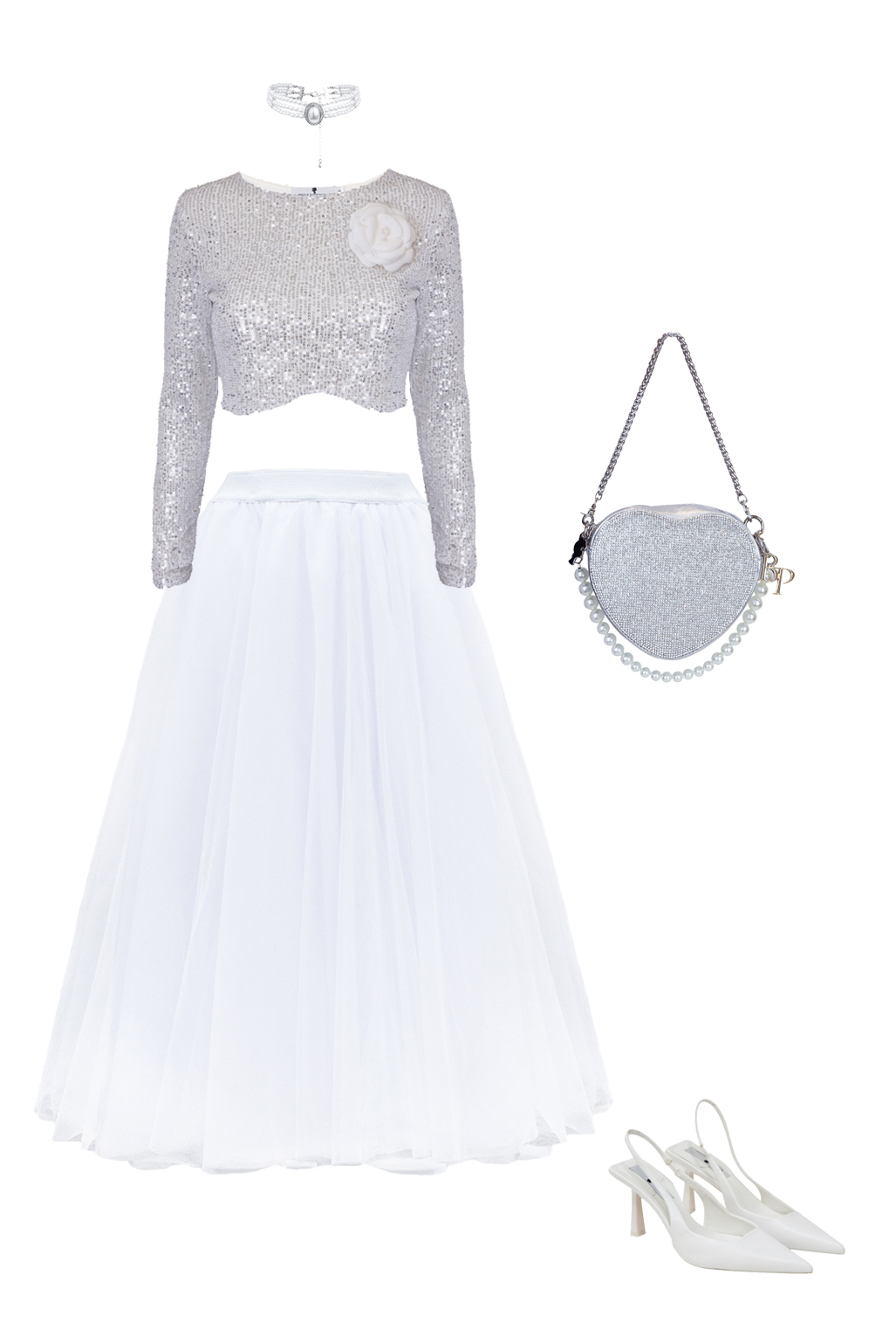Топ - кроп "Хэйс" белый, серебристые пайетки, с рукавами