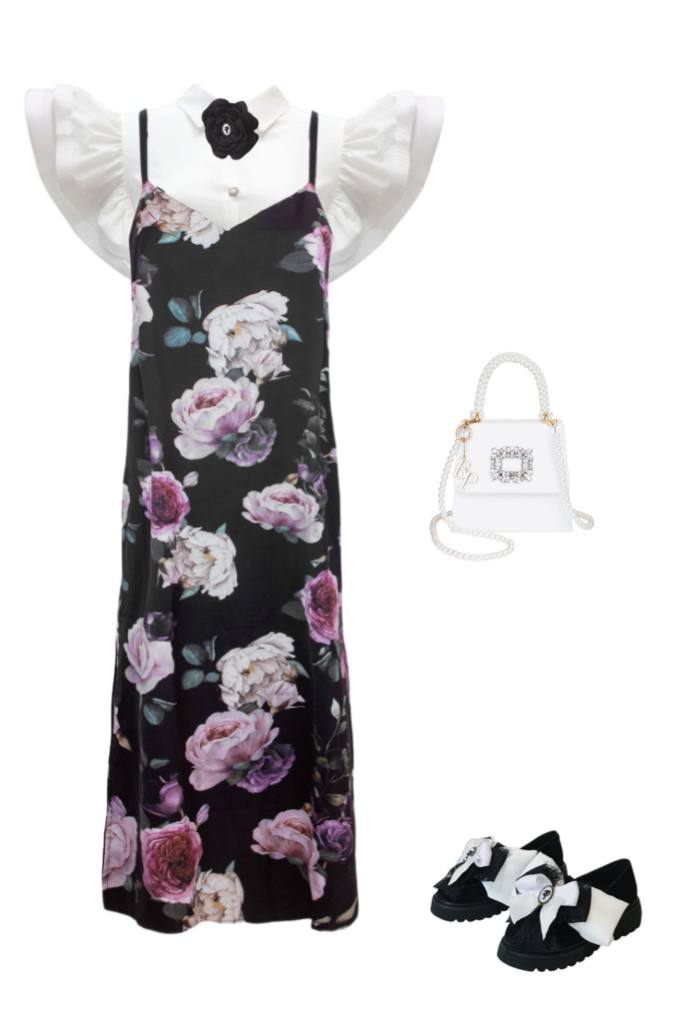 Платье-комбинация "Майен" черное, цветочный принт, макси
